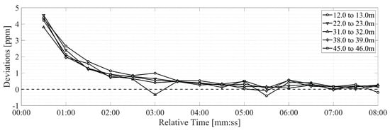 We unwrapped the observed phases and converted them to a metric scale to uncover time-dependent patterns in the cumulative displacements calculated from the interferometric phases. The disjoint acquisition sets were connected with each other by extrapolating a second order polynomial trend over the data gaps caused by the restarts mentioned in Section 3.3. As a further step, we investigated the averaged measured distance change over 30 s and noted an approximate linear dependency on distance. We present the quotient in Figure 11.