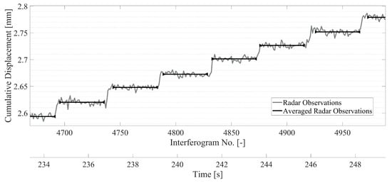 The resulting measurements from stable reflectors exhibit a systematic drift at the beginning of the acquisition period; that drift disappears with increasing observation time. We observed that these apparent changes in distance are linearly dependent on distance, which points towards a varying scale error. A plausible cause for the observed drifts is a frequency shift during warming-up of the crystal oscillator embedded in the radio frequency board. During the experiments, the board heated up from a temperature of the environment (16 °C) to a temperature of 50 °C in a matter of minutes after initialization. The observed scale changes of about 4 ppm are explainable by a shift in frequency of 0.35 MHz—a plausible deviation expected of the crystal oscillator embedded in the TIDEP-01012 MIMO-SAR system []. We have identified three practical approaches to mitigate this shift in frequency and we applied the last mitigation procedure for the following investigations.
