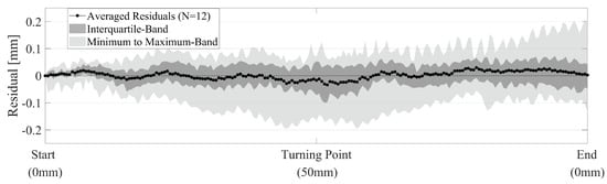 A periodic deviation of the average residuals with a frequency of 3 cycles per 50 mm is clearly visible. This cyclic pattern also appeared during the calibration process of the translation stage overseen by a laser tracker with an accuracy of a few μm. This is most likely explained by manufacturing imperfections of the translation stage introducing deviations in the corner cube’s position. Aside from these contributions, the residuals are mostly lower than ±100 μm and have an RMSE of approximately 25 μm. They do not seem to be symmetrically distributed around 0 and show a degree of auto-correlation not consistent with them being independently and identically distributed white noise. These systematic deviations are likely attributable to persistent changes in the atmospheric conditions as shown in Section 4.1. These results show that detecting displacements in-between longer periods of time is strongly limited by the refractivity errors introduced by the variation of the meteorological conditions.