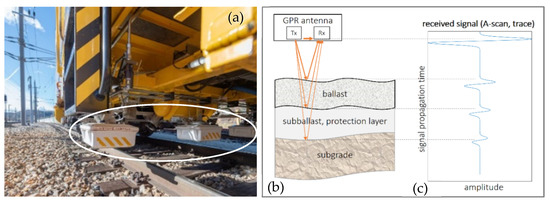 Data acquisition by means of ground penetrating radar (GPR) in railway track maintenance is an established, non-destructive measurement method for monitoring ballast conditions and other parameters [1,2,3,4]. GPR can provide measurements of the layer thickness and composition (lateral and longitudinal changes) of individual subgrade layers, moisture content and contamination condition of the ballast. It can map the lateral and longitudinal changes of ballast and subgrade layers to provide information on failure and deformation conditions with minimal disruption to train operations. In this respect, GPR can be used as an effective tool to uncover the causes of recurrent poor rail track geometries and unstable roadways [5]. It is also possible to identify and better investigate problematic railway sections by considering, for example, successive inspection campaigns that show a systematic increase in geometric fault parameters over time [6].