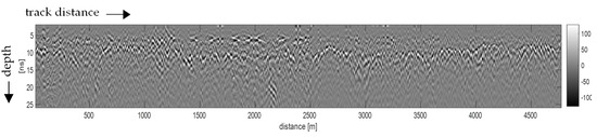 Typical radargram (or B–scan): the x-axis represents track distance (usually covering several kilometers), and the y-axis shows depth (typically indicated by radar signal propagation times).