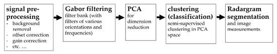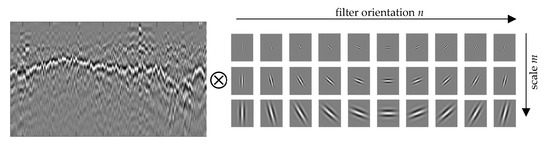 An introductory overview of the presented segmentation method is shown in Figure 3. First, the raw radargrams go through the same well-defined pre-processing steps routinely applied in GPR signal analysis (e.g., gain correction, filtering, signal whitening, start signal correction, etc.) to ensure comparability between different recordings. The results are then available in the form of an 8- or 16-bit grayscale image. Then, a multiscale 2D Gabor filtering is applied, which is described in detail in the following Section 2.2. A subsequent dimensionality reduction using PCA finally reduces the high-dimensional data representation to three characteristic feature dimensions (see Section 2.3). With this reduced representation (based on the features “amplitude”, “frequency”, and “local scattering”, as will be shown in Section 2.3), certain texture properties can then be precisely defined in a simple and objective manner. A corresponding pixel-based classification is then performed, which extracts exactly those regions in the radargram that match this texture definition. The image areas segmented in this way can then be further analyzed by means of image processing (e.g., edge detection).