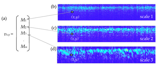Figure 6 exemplarily shows some of the filtered results and how different image features are captured by the Gabor filters. Those image areas that structurally correspond to the Gabor filter in use will show accordingly high filter responses, i.e., high-frequency information is captured at lower scales and as scale increases, less detailed low-frequency signal content is emphasized (so, scale and spatial frequency are inversely related). As mentioned above, for a number m of different filter scales, the corresponding m filter responses are determined for each pixel position. As an example, the first three resolution levels of a radargram are shown in Figure 6b–d. Each pixel in the radargram can then be represented by a m-dimensional vector vx,y or accordingly by a single data point in a m-dimensional feature space (Figure 6a). In general, similar local image structures (textures) in this feature space representation will form local clusters with a small Euclidean distance to each other—i.e., conversely, image structures with significantly different appearances (in terms of frequency and amplitude) will then have a feature space representation at a correspondingly larger distance and thus be easily separable from each other.