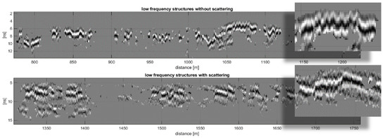 Upper: typical low-frequency structures without local scattering; lower: low-frequency structures with strong local scattering, which manifests as an overlaid noise-like pattern.