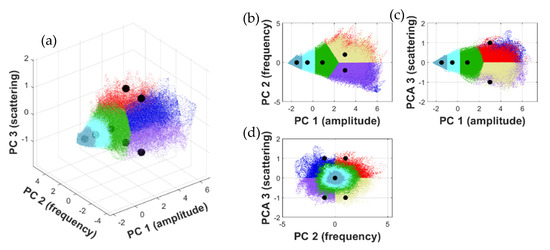 After projection of the original feature space on to the new 3D coordinate system (with the according basis axes representing amplitude, frequency, and scattering), the distribution of all radargram pixels can be visualized in the form of a 3D scatterplot (Figure 8a). In addition, the corresponding 2D projections are shown in Figure 8b–d. Specific parts of this 3D feature space now represent distinct radar signal properties, which in turn can be assigned, e.g., to characteristic radargram features (under the supervision of experts with experience in the interpretation of track radar signals). By simply defining a particular “region” in the 3D feature space (i.e., characterizing it in terms of amplitude, frequency, and scattering), the corresponding pixels (i.e., spatial position) in the radargram can be identified accordingly. This allows the expert the individual (and now objectifiable) definition of any number of specific classes in the 3D feature space (scatterplot coordinates), which, according to individual expertise, represent important subsurface structures. The black dots in Figure 8 exemplarily indicate the position of possible cluster centers that can be used for classification (i.e., the Euclidean distance to these centers determines the corresponding classification/coloring of the data points). The according visualization of these datapoints in the radargram results in a pixel-wise segmented image that automatically indicates characteristic rail track substructures, where the color indicates the corresponding class.