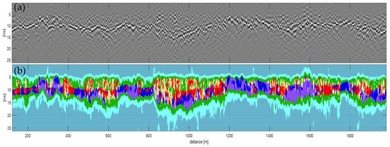 (a) Original radargram; (b) segmentation result of the proposed method, where different colors represent different relevant radargram structures based on objectifiable criteria (scatterplot coordinates) defined by railway radargram experts (e.g., blue/purple regions: track planum; yellow/red regions: indications of ballast fouling).