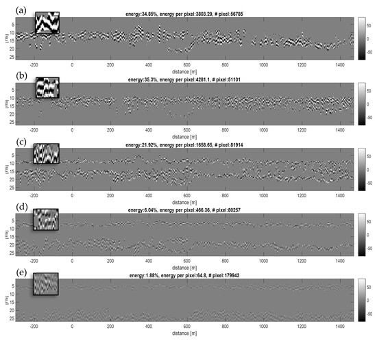 Another possible representation is shown in Figure 10, where five automatically extracted image segments of an examined railroad section are visualized separately. Each segment is characterized by specific signal frequency and amplitude ranges. This allows further investigations to be carried out, such as determining the signal energy or measuring the area (or “thickness”) of these specifically characterized texture segments, in order to automatically monitor the exceeding of critical threshold values (e.g., the amount of locally collected water typically represented by low-frequency and very high-amplitude regions without local scattering contributions).