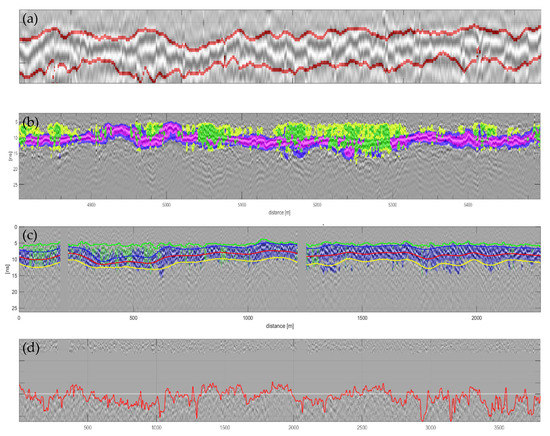 (a) Automatically extracted upper and lower limits of a railway planum (indicated in red), (b) a segmentation example where different colors indicate high– and low-frequency segments having high amplitudes exceeding a certain threshold; (c) automatic layer boundary extraction (green, red, yellow) relevant for water content estimation; (d) automated line extraction (red) for subgrade analysis.