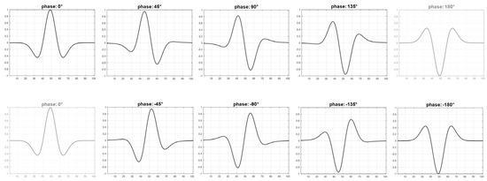 Based on the segmentation process described in this paper, phase shifts in extracted very low-frequency segments of the radargram can be determined. Signal traces with a specific phase angle are identified by applying a 1D cross-correlation (CC) with Ricker wavelets of tunable phase from −180° to 170° in steps of 5° (Equation (8), Figure 12). The Ricker wavelet (also referred to as Mexican Hat wavelet) is used here because of its close similarity to the measured radar reflection signal. In other words, cross-correlation is used to determine that Ricker wavelet that best matches the shape of the current signal trace:
