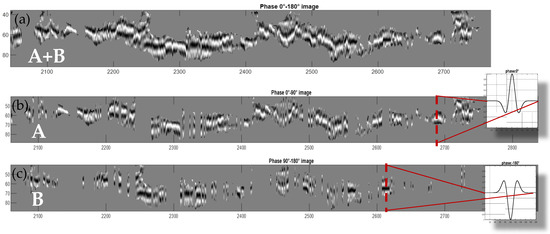 This additional signal phase information can be used for advanced classification and segmentation tasks where the identification of phase angle changes might be a valuable additional feature (e.g., for water content analysis or detection of buried objects). Figure 13a shows exemplarily an extracted low-frequency segment. Then a further subdivision of this segment is performed by defining a phase angle threshold as a distinguishing feature: those traces with a phase angle equal to approx. 0° are shown in the middle image, (Figure 13b) and those with a phase angle equal to approx. 180° are shown in the lower image (Figure 13c). As can also be perceived visually, the middle image consists of signals with a phase angle of approx. 0°, i.e., the signal maximum (bright) is clearly recognizable here in the central area of the image segment. In the lower image, on the other hand, the central peak area is continuously pronounced as a signal minimum (dark) indicating phase angles of 180°.