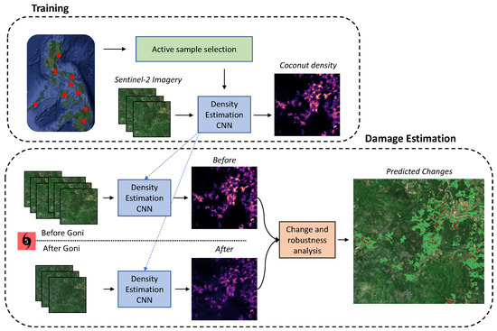 Overview of our method. We use active learning for efficient labelling to train a model for coconut tree density estimation. Damage estimation is performed using images from before and after the typhoon pass. After a robustness and change analysis we predict the following change classes: damaged, new or unchanged coconut, and non-coconut pixels.