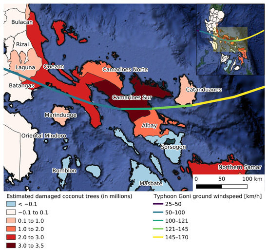 Overall, we estimated that 14.1 M coconut trees were affected by typhoon Goni inside our study area. We observed a larger impact on provinces that were directly under the typhoon’s path, including Camarines Sur, Quezon and northern Samar, all of which are home to large coconut plantations.