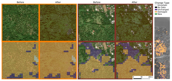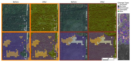 Figure 8 and Figure 9 show examples of areas in the provinces of Aurora and Samar, respectively, which exhibited only minor damages. Most of the areas there show no changes, which appears consistent with our high-resolution validation images. However, we observed very localised areas where damages are predicted. From the high-resolution validation images, there is no clear sign of damaged trees in these areas. We speculate that these predictions are due to subtle changes of the tree foliage, co-registration errors, or inaccurate predictions from the radiometrically more challenging post-typhoon images. The phenomenon is localised and does not appear systematically, therefore it does not significantly affect the large-scale analysis.