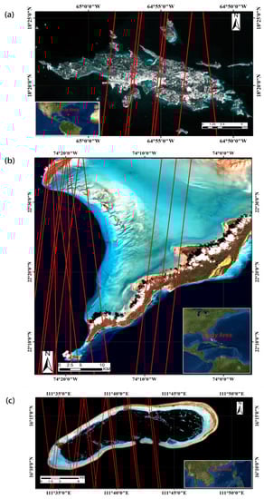 Overviews of three study areas: (a) Saint Thomas, US Virgin Islands—the background satellite image belongs to Sentinel-2 acquired on 15 January 2019. All red lines correspond to the laser trajectories of ICESat-2 on 22 November 2018, 10 February 2019, and 13 December 2020, respectively. A total of 80% of the ICESat-2 bathymetric points were randomly used to train the empirical model, and the remaining 20% as well as in situ data were used to verify the SDB-AP bathymetric result. (b) Acklins Island—the satellite image in the background belongs to Sentinel-2 acquired on 27 January 2020. All red lines correspond to the laser trajectories of ICESat-2 on 12 November 2018, 11 February 2019, 12 March 2019, 3 June 2019, and 2 September 2019. 80% of the ICESat-2 bathymetric points were used to train the empirical model, while the remaining 20% were used to verify the SDB-AP bathymetric result. (c) Huaguang Reef—the satellite image in the background belongs to Sentinel-2 acquired on 13 August 2019. All red lines correspond to the laser trajectories of the ICESat-2 on 22 October 2018, 22 February 2019, 21 April 2019, 19 April 2020, 19 July 2020, and 20 August 2020. 80% of the ICESat-2 bathymetric points were used to train the empirical model, while the remaining 20% were used to verify the SDB-AP bathymetric result.