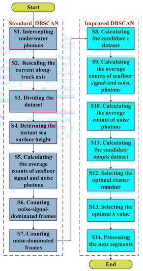 First, we intercepted the underwater photons and rescaled the current along the track axis to avoid calculation errors from rounding . Then, we divided the dataset into several segments. For each segment, we determined the instant sea surface height (SSH) and calculated the average counts of seafloor signal and noise photons. After that, we counted the noise–signal-dominated frames and noise-dominated frames. We calculated the candidate dataset. According to the candidate dataset, the average counts of seafloor signal and noise photons and the average counts of noise photons could be computed, and we obtained the candidate dataset. Finally, we selected the optimal and by iteration. Our adaptive DBSCAB codes were completed on the Python 3.9 platform. The flowchart for the adaptive DBSCAN algorithm is shown in Figure 2.