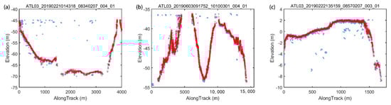 Here are three examples that present the outlier-removal results from the ICESat-2-derived signal photons in Figure 3a–c. The light blue points correspond to the noise photons, and the red points are seafloor photons after noise-outlier removal. It can be noted that our algorithm cleared out most outlier points and reserved seafloor signal photons efficiently.