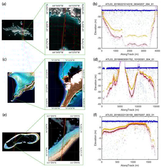 Based on our proposed algorithm in Section 3.1 and Section 3.2, the ICESat-2 signal photons were detected. Figure 5 provides ICESat-2 ground trajectory images, and corresponding detected elevation profiles over the St. Thomas site, Acklins Island site, and Huaguang reef site. Figure 5a,c,e demonstrates the enlarged satellite image and the sampled areas corresponding to the green box. Figure 5b,d,f illustrates the detected ICESat-2 underwater photons with and without refraction correction.