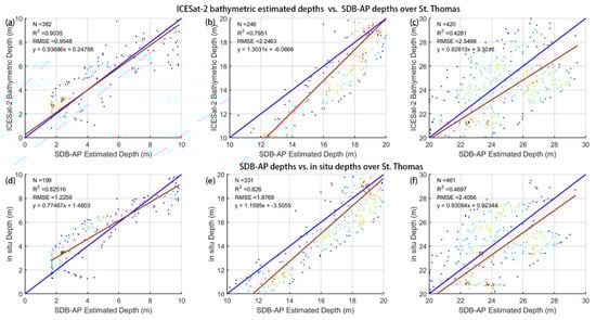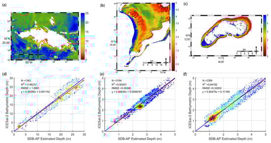 SDB-AP derived-bathymetric maps and error scatter plots of SDB-AP estimated depths vs. ICESat-2 bathymetric depths: (a) derived bathymetric maps in the St. Thomas site, (b) derived bathymetric maps in the Acklins Island site, (c) derived bathymetric maps in the Huaguang Reef site, (d) error scatter plots in St. Thomas site, (e) error scatter plots in the Acklins Island site, and (f) error scatter plots in the Huaguang Reef site. The red line is the 1:1 line, while the blue line represents the regression line. is the number of the training gridded bathymetric points from ICESat-2, and the regression equation details are shown in the top-left corner.