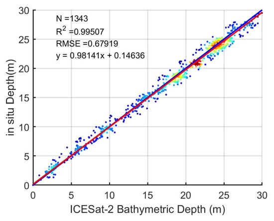 For all study sites, 80% of the detected ICESat-2 derived bathymetric photon points were used as model-training points, and the remaining 20% were used to validate the method’s validation accuracy. The in situ data over the St. Thomas site were also employed to quantify the performance of SDB-AP. In the following error scatter plots, the red line is the 1:1 line, and the blue line represents the regression line. is the number of the training gridded bathymetric points from ICESat-2, and the regression equation, R2, and RMSE details are also shown in the figures.