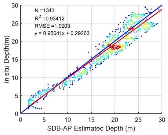 In Figure 7, the ICESat-2-derived bathymetric depths matched well with the in situ data over St. Thomas, with a good agreement of R2 = 0.9951 and a low standard Root Mean Squared Error (RMSE) at 0.68 m, which proves that our adaptive DBSCAN and outlier-removal algorithm are effective. For SDB-AP-estimated depths and the in situ data over St. Thomas, R2 was 0.93, and the RMSE was 1.91 m, as shown in Figure 8. Compared with the ICESat-2-derived bathymetric depths, the bathymetric accuracy of SDB-AP estimated depth decreases due to the error accumulation effects, including the ICESat-2 inversion error, the spatial matching error between ICESat-2 and Sentinel data, the Sentinel image process error, the empirical SDB model error, etc. Among them, the empirical SDB model error is the main error source; generally, the error for the empirical SDB model is about 2 m [,,,]. Figure 6d–f shows the performance of SDB-AP estimated depths when the ICESat-2-derived bathymetric points were used as testing data in the three study areas. The R2 in St. Thomas site reached the top (R2 = 0.96), followed by that in the Huaguang Reef site and Acklins Island site, 0.94 and 0.91, respectively. All RMSEs in the St. Thomas site, Acklins Island site, and Huaguang Reef site were less than 10% of the maximum depths, and the smallest RMSE was in the Acklins Island site with the value of 0.27 m.