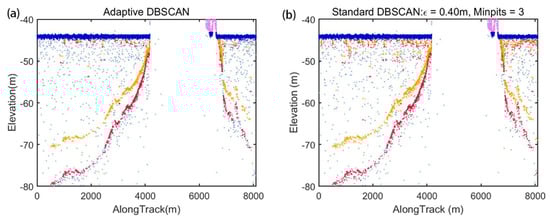 Comparison of the detected ICESat-2 signal photons based on our method and standard DBSCAN method on 12 December 2020: (a) adaptive DBSCAN; (b) standard DBSCAN with fixed and .