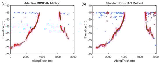 Outlier removal results over St. Thomas site: the bottom return photons (light blue), the outlier-removal signal photons (red). (a) adaptive DBSCAN; (b) standard DBSCAN with fixed and detection results.