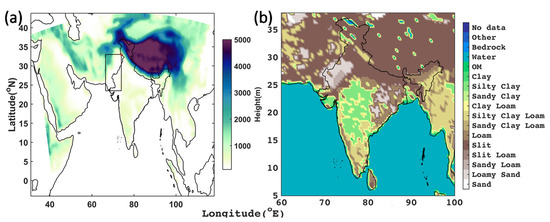 (a) The model domain with topographical height (shaded); (b) associated soil texture dominant categories. The North-Western (NW) parts of India and the adjacent regions are marked as the black box in (a).