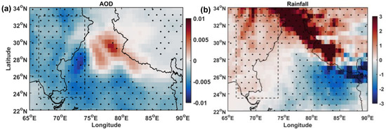 (a) Trends (year−1) in AOD and (b) rainfall for the period of study. Stipple shows the area where trends are significant at 95% confidence level, determined using the Mann-Kendall trend tests.