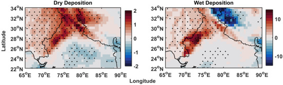 The surface emission and the dust burden are primarily controlled by the wind speed and soil texture in the RegCM [31,42]. On the other hand, the dust removal from the atmosphere is controlled by dry and wet removal processes (due to gravity and rain, respectively). Dust column burden is directly linked to the surface-emission (from the surface to atmosphere), loss (due to dry deposition and wet deposition), and transport (by wind). The dust column burden follows the trend as observed for AOD (not shown). Figure 3 explains the trend of two major dust removal processes. It is clear that both the dry deposition (gravity settling) and wet deposition (washout due to rain) shows a positive trend over the NW box. The positive trend in tracer loss (combined effect of dry and wet deposition) contributes to a reduction in aerosol optical depth. In addition, the wet deposition exceeds dry deposition more than five-fold in magnitude when averaged over the NW box (see Table 2). This signifies that rain is one of the primary causes of dust removal from the atmosphere, and hence is responsible for the negative AOD trends, as observed in Figure 1.