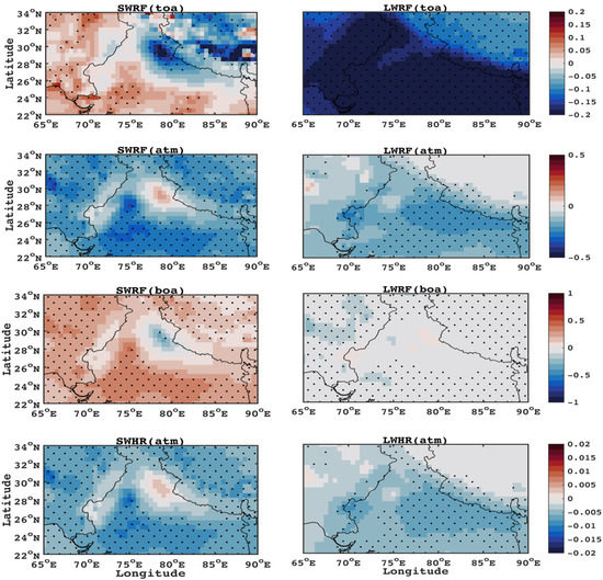 It may further be noted that the spatial trends of shortwave forcing are dominant mostly over the NW box and part of North-Western India. On the other hand, spatial trends of longwave forcing are prevailing over the Eastern regions. The atmospheric radiative forcing explains the amount of radiative flux absorbed or lost by the atmosphere due to the presence of an aerosol species. This is further explained using a matrix called the atmospheric heating rate (SWHR and LWHR in Figure 4) as given in Equation (2). The atmospheric heating rate is considered to be a sign of climate implication of aerosols and as calculated from RFatm [54,55,56]