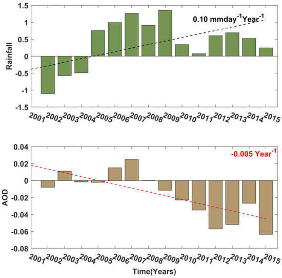 Figure 5 depicts the inter-annual variation of the simulated rainfall and AOD, averaged over the NW box, specified in Figure 2. Please note that the trend has been calculated taking anomalies for the month of May of different years with respect to the year 2001 (the first year of simulation or base year hereafter). It is visible that the rainfall and AOD during the summer (month of May) exhibit opposite trends.