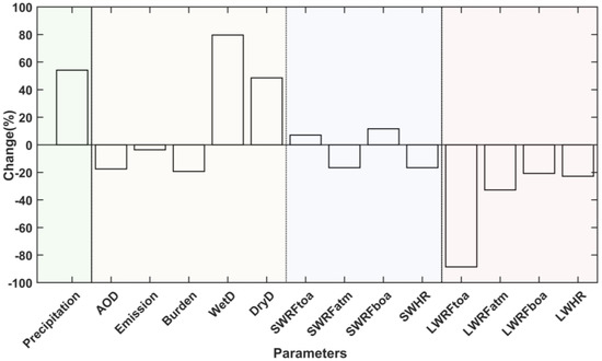 The overall changes in the above-discussed parameters over the NW box are expressed in percentage (Figure 6). A total change in the AOD with respect to the base year is estimated to be −17% and results in a 19% decrease in dust burden. The direction and magnitude of the change in burden and AOD are comparable with earlier studies [25,52]. The precipitation has increased more than 50% over the semi-arid/desert regions. In addition to this, wet deposition percentage change (~80%) exceeds almost twice that of dry depositions change (~48%).