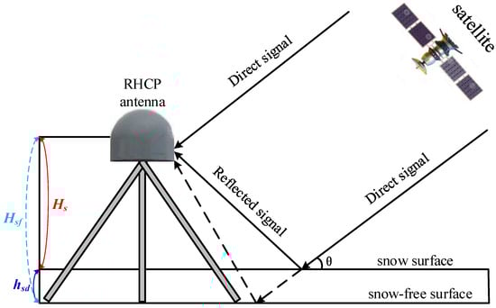 Schematic diagram of GNSS-IR snow depth retrieval. After the satellite sends the signal, the right-handed circular polarized (RHCP) antenna receives the direct signal and the surface reflected signal, and produces interference effect at the receiver. The snow surface reflector height () and snow-free surface reflector height () are calculated, respectively, by analyzing the oscillation effect, and the snow depth () is calculated by comparing the differences between them. θ is the elevation angle of the satellite.