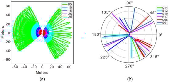 Figure 5a shows the Fresnel reflection region of GPS G10 satellite with DOY of 024 in 2017 at P387 station. Assuming that receiver antenna height is 2 m, different color lines represent the reflection regions with different satellite elevation angles. With the increase in the elevation angle, the Fresnel reflection region will be smaller. The figure shows the Fresnel reflection region map of the satellite elevation angle of 5–25 degrees.
