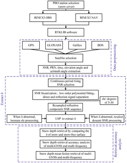 The technical process of multi-GNSS and multi-frequency GNSS-IR snow depth retrieval. Among the ele is the satellite elevation angle.