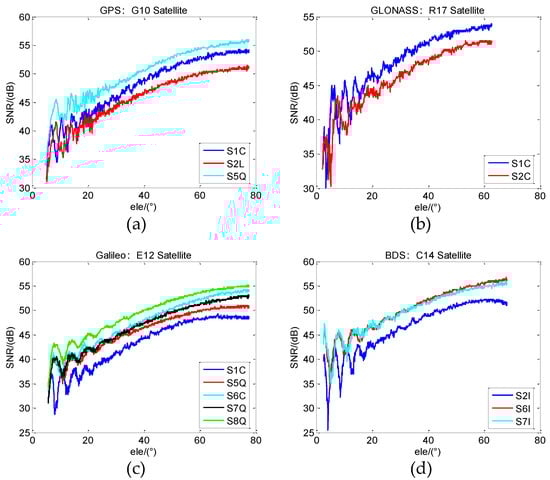 In the article, multi-GNSS and multi-frequency SNR sequences are extracted by RTKLIB software. Figure 7 shows the rising SNR sequences of G10 (S1C, S2L, and S5Q), R17 (S1C and S2C), E12 (S1C, S5Q, S6C, S7Q, and S8Q), and C14 (S2I, S6I, and S7I) satellites in the four GNSS systems on DOY 024 in 2017. Through data preprocessing, it is found that the SNR values of G10 (S1W and S2W) are the same, and that the SNR difference with other signal frequencies is significant. Therefore, these two types of SNR data are not used for the experimental in the article. Figure 7 shows the SNR sequence change in the elevation angle from low to high.