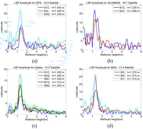 Based on the LSP method analysis of the SNR sequence of the multi-GNSS and multi-frequency reflection signal of DOY 024 in 2017, the results are shown in Figure 9.