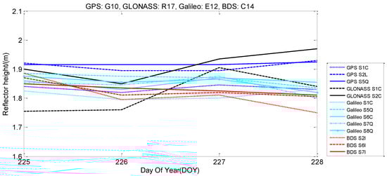 In order to weaken the difference between the multi-GNSS and multi-frequency LSP results, this article proposes that the snow-free surface reflector height is analyzed by the multi-GNSS and multi-frequency LSP results. Using the above method, the four-day accumulated data (satellites G10, R17, E12, and C14) of DOY 225–228 in 2017 were selected for processing; this period is about October and belongs to the defined bare soil period. This article selects the data of this period to process, which can reduce the influence of surface vegetation on signal propagation. The multi-GNSS and multi-frequency reference values were obtained by averaging the four-day LSP results.