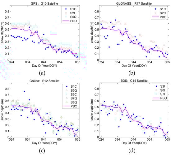 The snow depth is obtained by comparing and analyzing the difference in reflector height under snow-free and snow surfaces. The results of the different frequency retrievals of GPS, GLONASS, Galileo, and BDS are compared with the PBO snow depth data, and the results are shown in Figure 11.