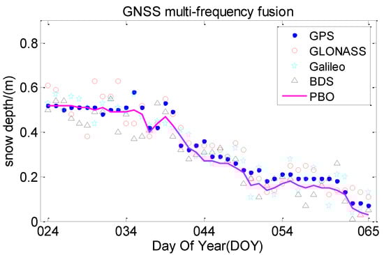 Figure 13 shows that the mean fusion results between the multi-GNSS system are in good agreement with the PBO snow depth results, and that the trend is basically the same.