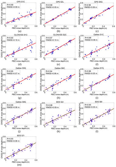 Figure 14 shows the correlation of multi-GNSS and multi-frequency GNSS-IR snow depth retrieval results compared with the PBO snow depth. Table 3 shows the specific R and RMSE.