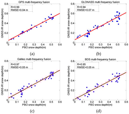 Mean fusion retrieval is carried out for multi-frequency retrieval results under the four GNSS systems; the accuracy between the retrieval results and PBO snow depth are further analyzed, as shown in Figure 15.