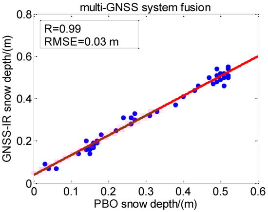 Figure 16 shows that the R between the mean fusion results of the multi-GNSS system and PBO snow depth was 0.99, showing a strong correlation. At the same time, the RMSE was 3 cm, and the error was also significantly reduced, indicating the effectiveness of this method.