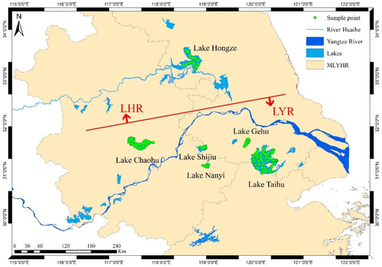 The YRD (Figure 1) is located in the lower reaches of the Yangtze River in China, bordering the Yellow Sea and the East China Sea. It is China’s largest area of urban agglomeration and the most economically active region, contributing 23.5% of the gross domestic product [17]. Taking the Jianghuai Watershed and Tongyang Canal as the boundary (simply indicated by a red line in Figure 1), the YRD can be divided into the lower Huai River (LHR) part and the lower Yangtze River (LYR) part. The YRD region has many river networks and a large number of lakes, with a total number of more than 200 lakes with an area ranging from 0.01 km2 to more than 2000 km2. These provide important water resources for the YRD region [18,19]. Most of these lakes are shallowly turbid lakes with algal blooms and man-made sand mining activities, resulting in large spatiotemporal variability in suspended particulates and phytoplankton [20]. In this study, due to the satellite image spatial resolution, 41 lakes with an area larger than 10 km2 in the YRD were selected to study trophic state variation characteristics.