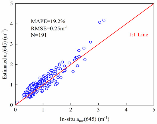 Finally, the nonwater absorption at 645 nm (anw(645)) can be deduced using step 6 of Table 1. According to the in-situ data, the absorption of CDOM at 645 nm (acodm(645)) was found to account for only 7.2% of ap(645). In other words, compared to ap(645), acodm(645) was so small that it could be ignored, so ap(645) was approximately equal to anw(645). The scatterplot of in-situ anw(645) and derived ap(645) is shown in Figure 3. The performance was satisfactory with MAPE of 19.2%, RMSE of 0.25 m−1, and validation points distributed approximately along the 1:1 line.
