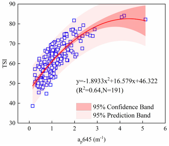 In this study, the particle absorption at 645 nm (ap(645)) was used to estimate the lake eutrophic state due to the stronger correlation between ap(645) and the TSI. Therefore, 2/3 of the total samples (N = 191) are used to develop the relationship between the TSI and ap(645), and the remaining 1/3 of the total samples (N = 95) are applied to the algorithm validation. Five mathematical function types (linear, logarithmic, exponential, power, and quadratic) were examined to establish the relationship between the TSI and ap(645) with the quadratic function having the best performance by having the highest determination coefficient. The TSI estimation algorithm based on ap(645) is described by Equation (10) with results illustrated in Figure 4.