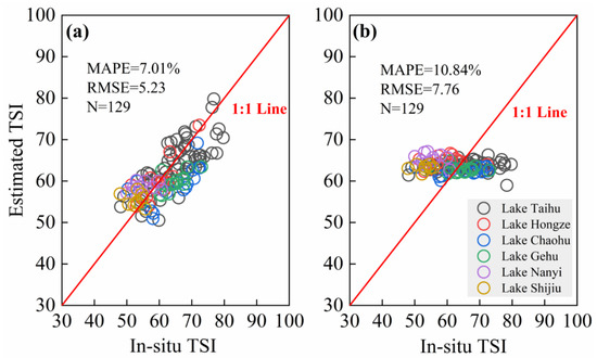 (a) Comparison of in-situ TSI and estimated TSI based on our study; (b) Comparison of in-situ TSI and estimated TSI based on the algorithm of Shi.