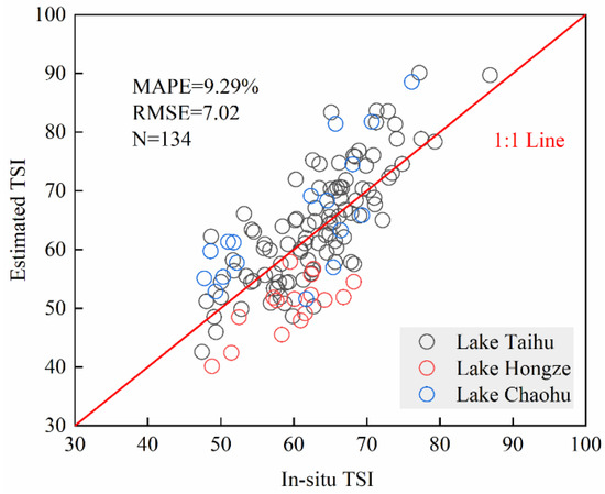 An independent validation dataset including 129 sampling data points was used to evaluate the proposed algorithm. Ninety five samples were from Lake Taihu, Lake Chaohu, and Lake Hongze with the other 34 samples from Lake Nanyi, Lake Shijiu, and Lake Gehu. The MAPE and RMSE were calculated using Equations (8) and (9) with values of 7.01% and 5.23, respectively. The scatter plot of the measured TSI and estimated TSI is shown in Figure 5a with values approximately distributed along the 1:1 line suggesting good agreement. The accuracy results demonstrated that the TSI estimation algorithm based on ap(645) has satisfactory performance.