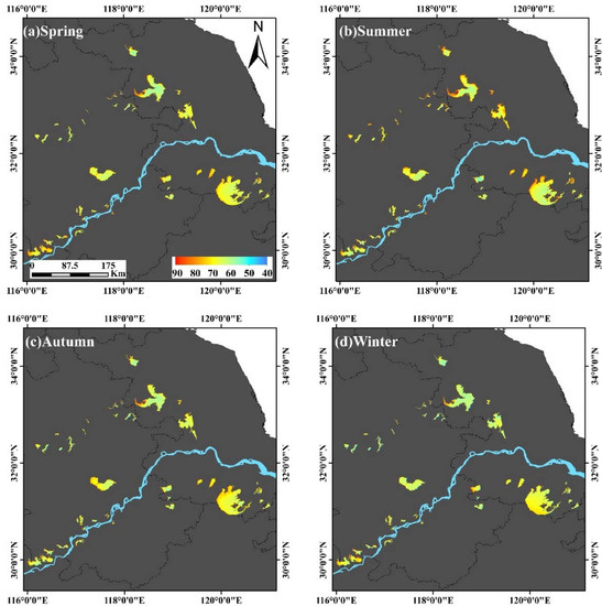Based on MODIS Aqua remote sensing images from 2002 to 2020, the spatial distribution characteristics of the TSI in the YRD are intensively analyzed and shown in Figure 7. The four subplots in Figure 7 represent the spatial distribution characteristics of different seasons and it can be clearly seen that the lake trophic state of the YRD changes significantly with the season. As seen in Figure 7, the overall lake TSI in the YRD is highest in summer (68.9 ± 7.52) and lowest in winter (65.75 ± 7.4), and there is no significant difference in spring and autumn. At the same time, it was found that 40.5% of lakes had a TSI that peaked in summer while the minimum value was observed in 71.4% of lakes in winter. In summer, many hypereutrophic levels can be observed in Lake Taihu, Lake Changdang, and Lake Chaohu. Previous studies have demonstrated that the highest Chla concentration is often found in both summer (June to August) and autumn (September to November) in Lake Taihu. In Lake Chaohu, the concentrations of Chla and TP are also the highest in summer. Therefore, the increase in these concentrations would lead to the most hypereutrophic state in the summer.