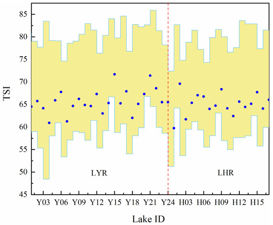 Statistics of the mean TSI values of all lakes in the YRD. (The yellow bar represented the distribution range of the lake TSI in the YRD; the blue dot represented the average TSI of each lake; the red line was used to distinguish the lake groups belonging to LYR and LHR).